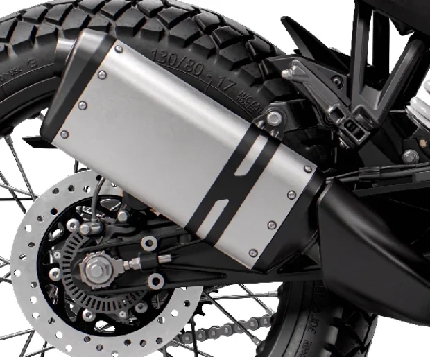 The KTM 390 ADVENTURE features a lightweight, precision-crafted exhaust system, aids in delivering instant, smooth power and is specifically designed to not affect the rider's movement on the bike.