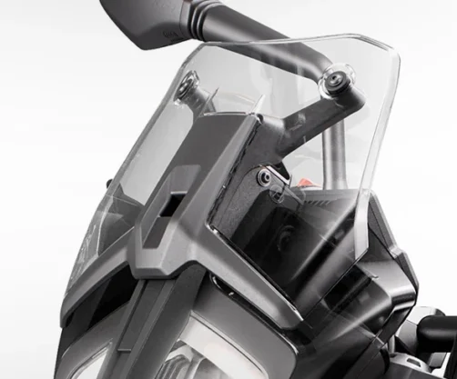 The KTM 390 ADVENTURE's windshield is an efficient deflector. It can also be mounted in a lower or higher position to suit the rider's size or needs.