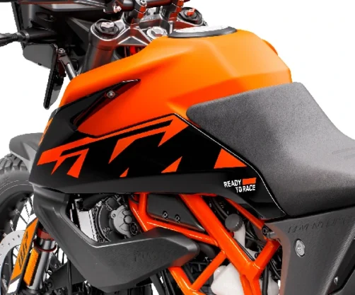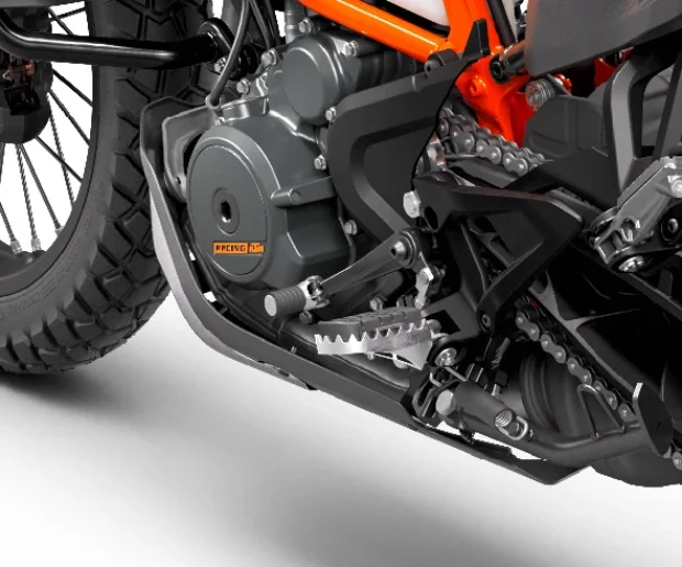 The 14.5L fuel tank provides 400+ kms of tank range. The tank spoilers and rear side panels are slightly wider than the seat for optimized control when standing on the pegs, while the shape of the fuel tank is optimized to offer freedom of movement when tackling tricky technical terrain. A robust engine guard also makes its intentions known by protecting the engine and exhaust when venturing off the tarmac into the dirt.