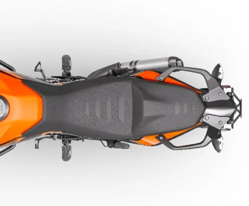 The KTM 390 ADVENTURE features a two-part seat that provides unmatched comfort and rider control. Being narrower in the front than the rear, it not only provides easy accessibility for shorter riders but also better control on difficult terrain. The seat can be easily removed for access to the airbox and a small storage compartment underneath.