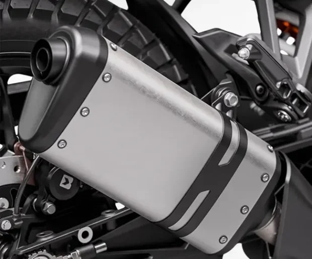 The KTM 390 ADVENTURE features a lightweight, precision-crafted exhaust system, aids in delivering instant, smooth power and is specifically designed to not affect the rider's movement on the bike.