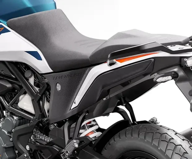 The removable, steel trellis subframe is developed to be compact and lightweight, but strong enough to carry a passenger and luggage, while negotiating the tough conditions that can be expected when adventure riding.